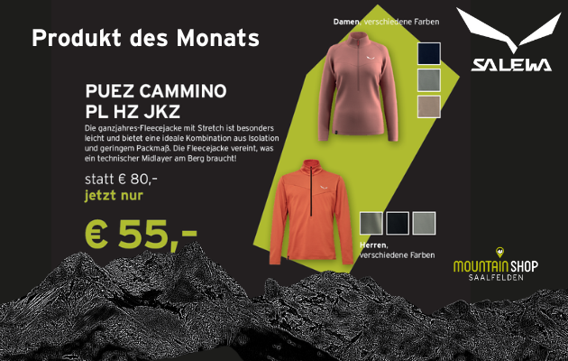 Es gibt kein falsches Wetter − nur falsche Kleidung: Im Moutainshop Saalfelden findest du Bekleidung für Sommer und Winter. Egal ob Schuhe, Ausrüstung, Jacken, Fleece, T-Shirts, kurze und lange Hosen, sowie Funktionskleidung in unserem Online Shop wartet das perfekte Angebot für Männer, Frauen und Kinder. Unsere Produkte überzeugen mit Funktionalität, Qualität und Komfort und bereiten dir eine wunderschöne Zeit auf dem Berg.